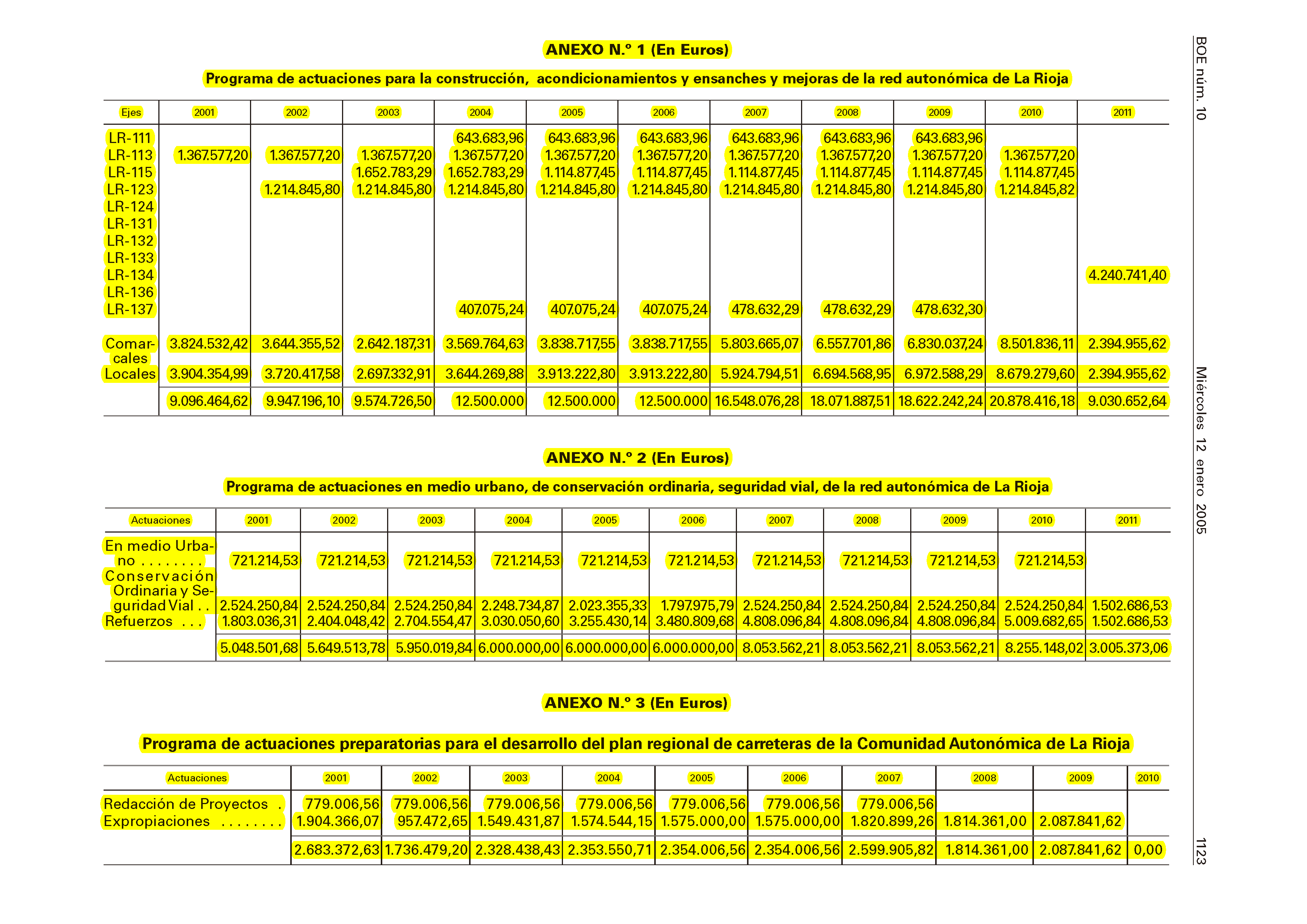 De conformidad con el artículo 10 de la Ley 8/2000, de 28 de diciembre, por la que se aprueba el Plan Regional de Carreteras se procede, por razones de coyuntura presupuestaria, a modificar los anexos primero, segundo y tercero a los que se refiere el artículo 4 del mencionado texto legislativo, los cuales quedarán establecidos respectivamente, en la forma que figura en los Anexos 1., 2. y 3.