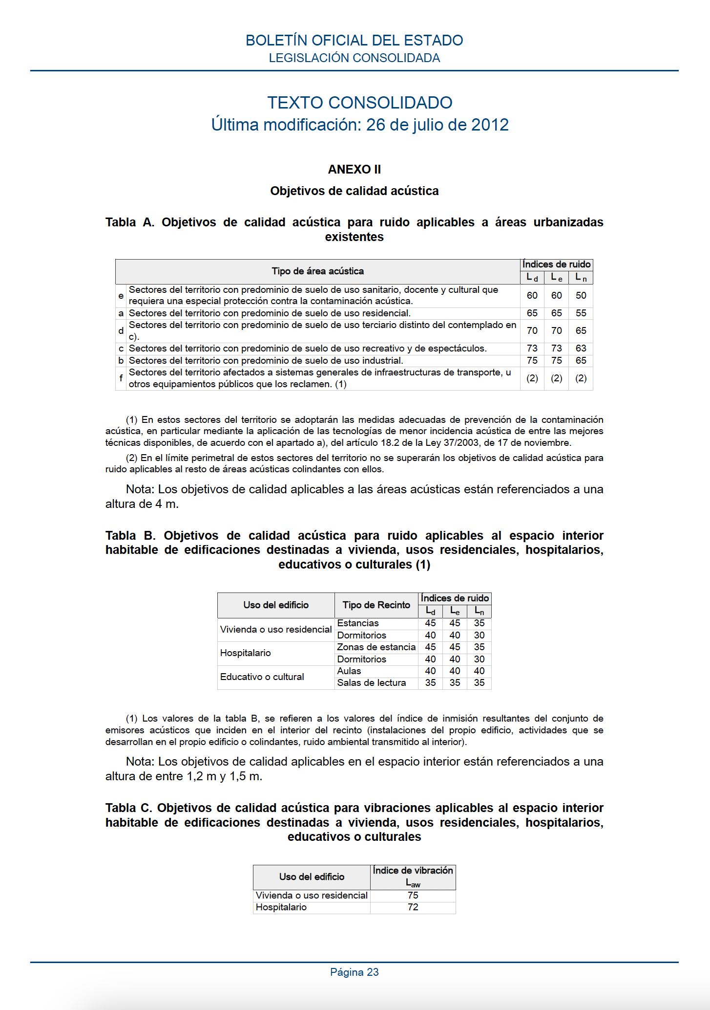 Por ello el presente real decreto tiene como principal finalidad completar el desarrollo de la citada Ley. Así, se definen índices de ruido y de vibraciones, sus aplicaciones, efectos y molestias sobre la población y su repercusión en el medio ambiente; se delimitan los distintos tipos de áreas y servidumbres acústicas definidas en el artículo 10 de la Ley 37/2003, de 17 de noviembre; se establecen los objetivos de calidad acústica para cada área, incluyéndose el espacio interior de determinadas edificaciones; se regulan los emisores acústicos fijándose valores límite de emisión o de inmisión así como los procedimientos y los métodos de evaluación de ruidos y vibraciones.