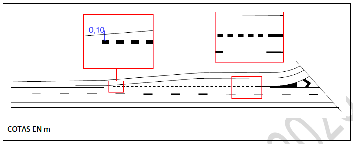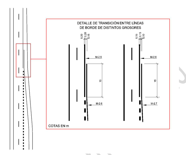 Cuando las líneas de borde de la calzada principal y de las cuñas o carriles de aceleración y deceleración sean de distinto grosor, se efectuará la transición entre ambas líneas de borde tal y como se muestra en la siguiente figura:
