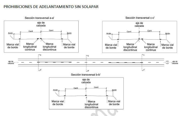 En los casos sin solape de prohibiciones, la línea discontinua coincidirá con la línea geométrica de separación de carriles.