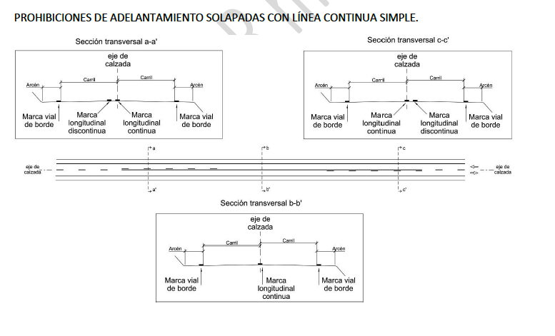 - a) Tramo de solape de prohibiciones con línea continua simple. La línea continua será coincidente con la línea geométrica de separación de carriles.