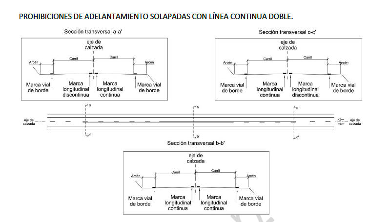 - b) Tramo de solape de prohibiciones con línea continua doble. Se dispondrán las marcas longitudinales centradas con el eje de la carretera.