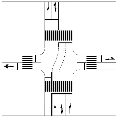 - b) Indicar dentro de una intersección la prolongación ideal de las marcas viales para separación de carriles o para borde de calzada en los casos en que la trayectoria a seguir por los vehículos no resulte obvia.
