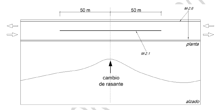 se dispondrá siempre línea de borde de calzada continua de 0,15 m de ancho (M-2.6). No se dispondrá marca de separación de sentidos, pues cuando el conductor tenga la visibilidad suficiente para tener certeza de que no se aproxima ningún vehículo en sentido contrario, circulará por el centro de la calzada. De manera optativa, se podrá disponer marca de separación de sentidos en los tramos en los que se produzca una reducción de la visibilidad debido al trazado en alzado (cambio de rasante) en los 50 m anteriores al punto en el que vuelve a recuperarse la visibilidad. En estos casos, se utilizará marca longitudinal continua de 0,15 m de anchura (marca M-2.1).