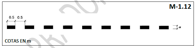 Línea discontinua cuya anchura "a" será la misma que se venga utilizando en la marca longitudinal para separación de carriles o para borde de la calzada, con 0,5 m de trazo y 0,5 m de vano.