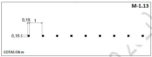 Cuadrados de 0,15 m de lado, con una separación entre ellos de 1 m. Cuando concurran ambas circunstancias, se seguirán los criterios descritos para las carreteras de plataforma menor o igual de 5,5 m.