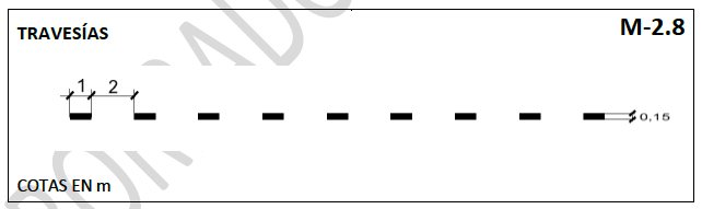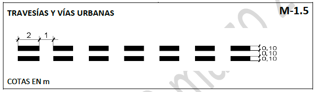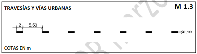 Doble línea discontinua de 0,15 m de anchura, con 3,50 m de trazo, 1,50 m de vano y una separación entre líneas de 0,10 m.