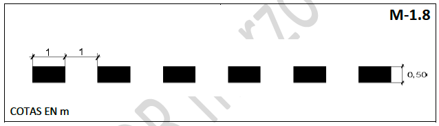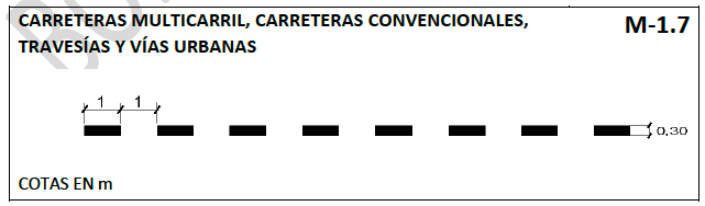 Línea discontinua de 0,30 m de anchura, con 1 m de trazo y 1 m de vano.