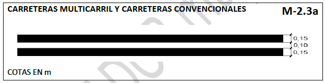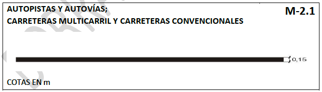 - M-2.1, para autopistas, autovías, carreteras multicarril y carreteras convencionales. (ANTES M- 2.2a) Línea continua de 0,15 m de anchura y longitud mínima de 100 m.