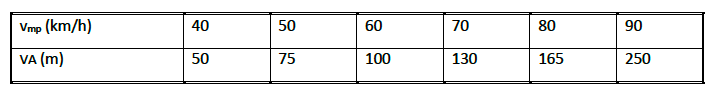 Tabla 1.- Visibilidad de adelantamiento (VA) necesaria mínima para no iniciar la marca continua de prohibición de adelantamiento o para finalizarla.