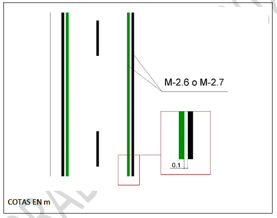 Para delimitar los bordes de la calzada se utilizará línea longitudinal discontinua M-1.9, de 0,15 m de anchura, con 3,50 m de trazo y 1,50 m de vano. Los arcenes podrán pintarse de un color distinto al de la calzada.