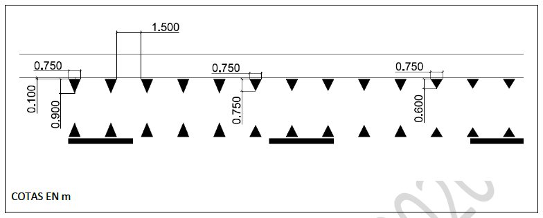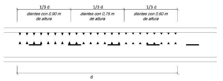 Se podrán disponer estas marcas en la sección previa a un tramo en el que debe reducirse la velocidad de circulación notablemente con respecto al tramo precedente –por ejemplo, al acceder a una travesía o vía urbana-, y en el que los conductores deberán adaptar su conducción a las nuevas circunstancias del entorno de la carretera –como puede ser la presencia de peatones-. La longitud del tramo en el que se dispongan los dientes de dragón será aproximadamente de entre 50 y 150 m, teniendo en cuenta las características tanto de la infraestructura como del entorno. En cuanto a la geometría de los «dientes», serán triángulos isósceles, con una base de 0,75 m. En cuanto a su altura, los situados en el primer tercio del tramo serán de 0,60 m, los situados en el tercio siguiente de 0,75 m y de 0,90 m los del último tercio.