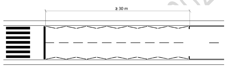 En el tramo anterior a un paso de peatones en el que se haya detectado que la velocidad de circulación de muchos vehículos es superior a la deseable, se podrán disponer líneas de borde quebradas. El objetivo será hacer consciente al conductor de que se aproxima a una sección particular, por lo que deberá reducir la velocidad a la que circula hasta alcanzar los valores establecidos. La longitud del tramo en el que se disponga esta configuración será de al menos 30 m.