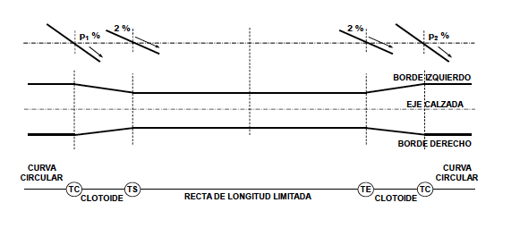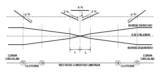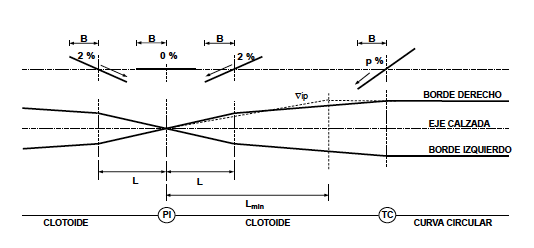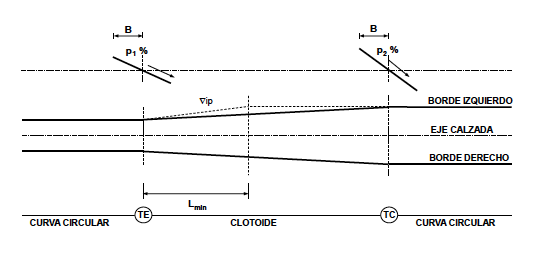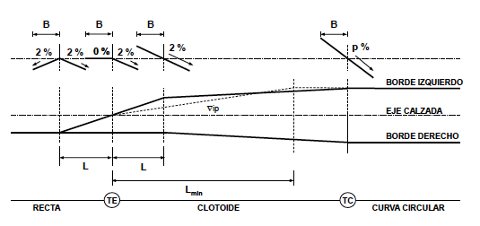 Dado que en general la transición del peralte se desarrollará a lo largo de la curva de acuerdo en planta (clotoide), habiéndose desvanecido previamente el bombeo que exista en sentido contrario al del peralte definitivo (apartado 4.7), la longitud de la transición del peralte y, consecuentemente, la longitud de la clotoide tendrá un valor mínimo definido por la expresión: