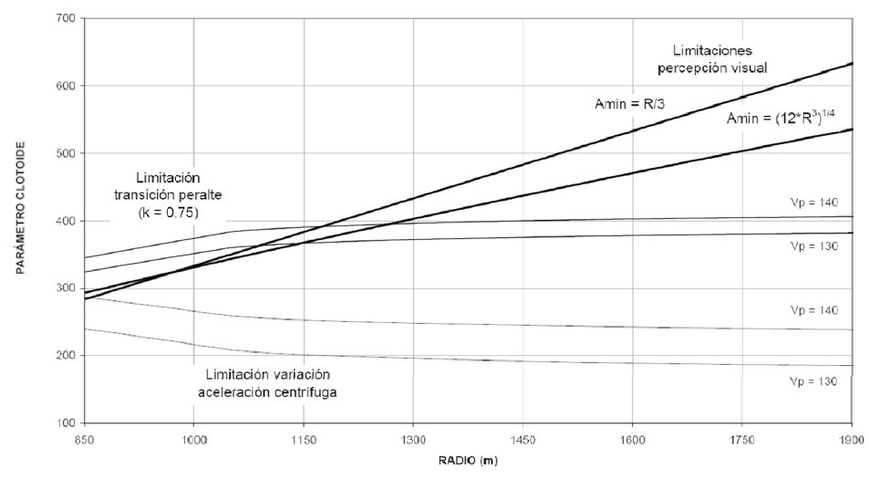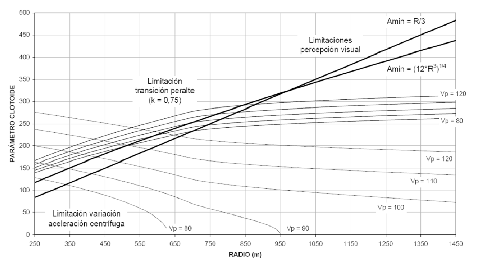 Suponiendo a efectos de cálculo que la clotoide se recorre a velocidad constante igual a la velocidad específica de la curva circular asociada de radio menor, el parámetro en metros, deberá cumplir la condición siguiente:
