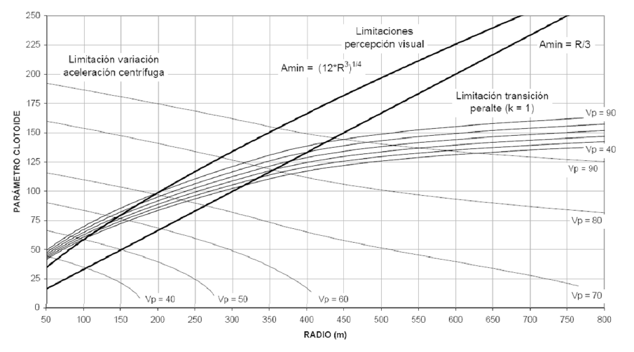 lo que supone una longitud mínima (Lmín) de la clotoide en metros dada por la expresión: