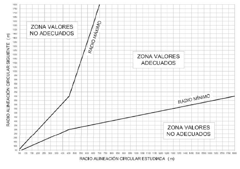 Cuando se unan dos alineaciones curvas consecutivas (constituida cada una por una curva circular con sus correspondientes curvas de acuerdo) sin alineación recta intermedia o con una recta de longitud limitada (epígrafe 4.2.2), la relación de radios de las curvas circulares no sobrepasará los valores obtenidos a partir de las expresiones de la Tabla 4.7 representadas en la Figura 4.5.