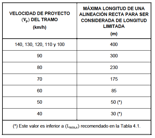 En la Tabla 4.2 se incluyen los valores máximos de las longitudes de las alineaciones rectas para ser consideradas como recta de longitud limitada.
