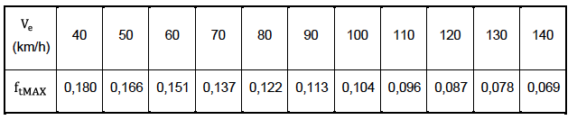 Para toda curva circular con el peralte máximo correspondiente se cumplirá que, recorrida la curva circular a la velocidad específica (Ve), no se sobrepasarán los valores del coeficiente transversal máximo movilizado (ftMAX) de la Tabla 4.3.