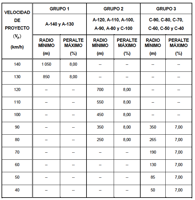 El radio mínimo asociado a una determinada velocidad de proyecto (Vp) se indica en la Tabla 4.4.