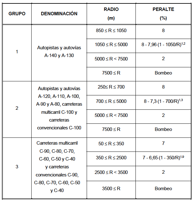 Se diseñará bombeo y no peralte, en las curvas circulares de radio superior a siete mil quinientos metros (> 7 500 m) en las carreteras de los Grupos 1 y 2 y de radio superior a tres mil quinientos metros (> 3 500 m) en las carreteras del Grupo 3.