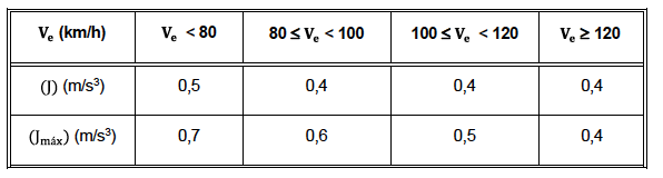 A efectos prácticos, se adoptarán para J los valores indicados en la Tabla 4.6, debiendo sólo utilizarse los valores de Jmax cuando suponga un menor coste tal, que justifique suficientemente esta restricción en el trazado, aunque conlleve una disminución de la comodidad.