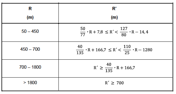 Cuando se unan dos alineaciones curvas consecutivas (constituidas cada una por una curva circular con sus correspondientes curvas de acuerdo) con alineación recta intermedia de mayor longitud que la correspondiente a la recta de longitud limitada (Tabla 4.2) el radio de la curva circular de salida R´, en el sentido de la marcha, será: