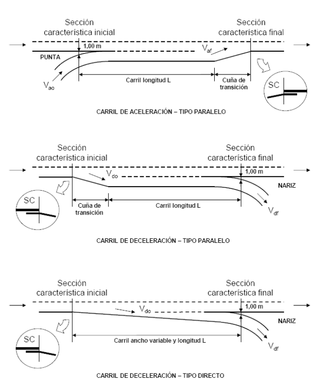Los carriles de aceleración y los de deceleración serán de tipo paralelo. Excepcionalmente, previa expresa justificación, cuando la velocidad de proyecto (Vp) sea inferior a cien kilómetros por hora (< 100 km/h) los carriles de deceleración podrán ser de tipo directo.