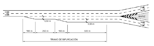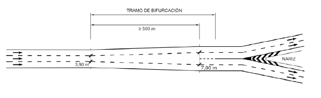Las bifurcaciones con incremento del número de carriles utilizando carriles de ancho variable (carriles bífidos) se efectuarán de acuerdo con el esquema de la Figura 8.12 aplicable a la adición de un carril. El aumento del ancho del carril bífido desde tres metros y cincuenta centímetros (3,50 m) hasta siete metros (7,00 m) se efectuará en una longitud mayor o igual que quinientos metros (≥ 500 m).