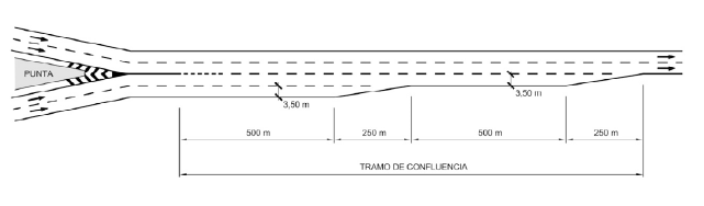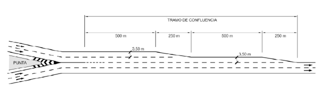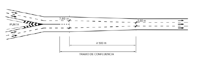 Las confluencias con disminución del número de carriles utilizando carriles de ancho variable (carriles bífidos) se efectuarán de acuerdo con el esquema de la Figura 8.11 aplicable a la supresión de un carril. La reducción del ancho del carril bífido desde siete metros (7,00 m) hasta tres metros y cincuenta centímetros (3,50 m) se efectuará en una longitud mayor o igual que quinientos metros (≥ 500 m).