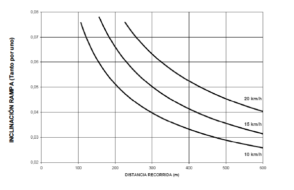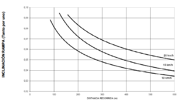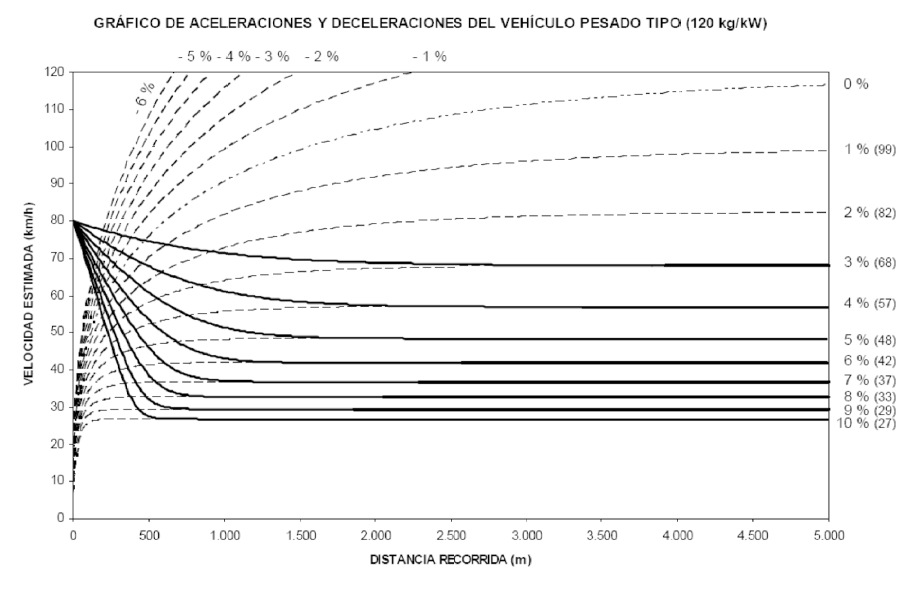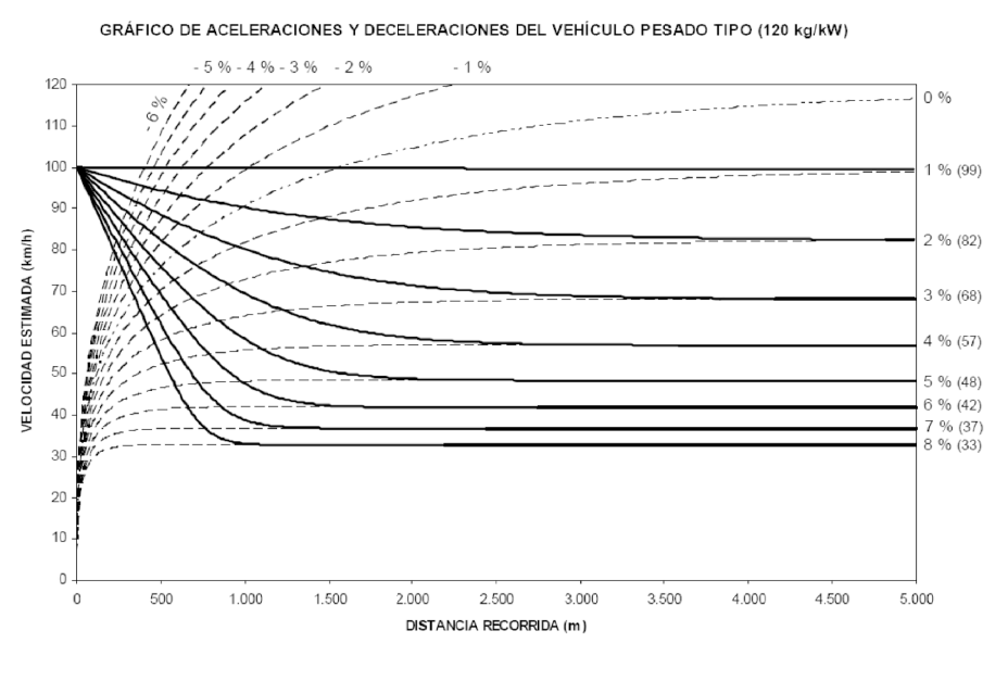 Se podrán utilizar los gráficos incluidos en las Figuras 8.15 y 8.1621 para estimar, en condiciones generales, las prestaciones de los vehículos pesados en rampa y pendiente con el fin de evaluar los correspondientes niveles de servicio.