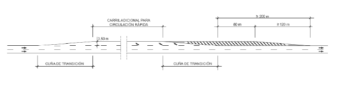 Al final de los carriles adicionales para circulación rápida después de la cuña de transición definida en la Tabla 8.1, se dispondrá adicionalmente un tramo cebreado con una longitud mayor o igual que doscientos metros (≥ 200 m).