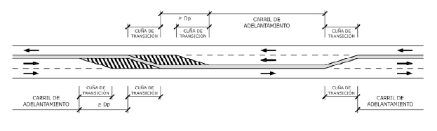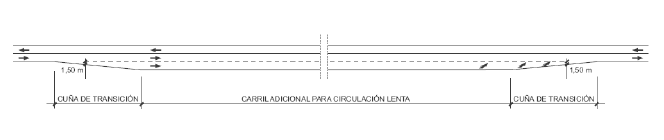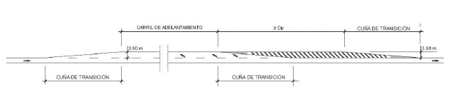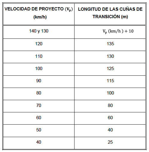 Antes del inicio y después del final de los carriles adicionales en rampa se dispondrán cuñas de transición. Las longitudes de las cuñas de transición se establecen en la Tabla 8.1 en función de la velocidad de proyecto (Vp) de la carretera.