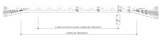 Se deberá comprobar que entre la entrada del ramal de transferencia a la vía complementaria para regulación de accesibilidad y movilidad y la siguiente salida desde dicha vía (en el caso más habitual de conexión del ramal de transferencia por la izquierda y salida por la derecha) exista la longitud suficiente para garantizar, con un adecuado nivel de servicio, las maniobras de trenzado entre ambas (teniendo en cuenta todos los posibles carriles a trenzar en la citada vía complementaria). Análogamente, se deberá comprobar la existencia de longitud suficiente de trenzado entre la salida al ramal de transferencia desde la vía complementaria y la anterior entrada en esta calzada. En cualquier caso, para estas longitudes se fija un mínimo de doscientos cincuenta metros (≥ 250 m). En el supuesto de que se genere un carril en la vía complementaria entre la entrada y una posterior salida de ramales de transferencia consecutivos, las longitudes de trenzado se medirán desde las secciones que corresponderían al final del carril teórico de convergencia y al principio del teórico de divergencia que habría sido necesario disponer como mínimo.