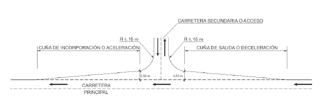 En las conexiones con una carretera (incluyendo las vías que tienen la consideración de tales -apartado 2.7-) se proyectarán, para facilitar los movimientos de entrada y salida de los vehículos, alguno de los siguientes elementos: