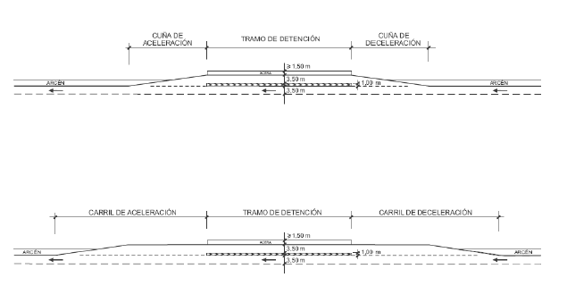 Las paradas constarán de un carril de cambio de velocidad o cuña de deceleración, de un tramo para detención de estos vehículos y de un carril de cambio de velocidad o cuña de aceleración.
