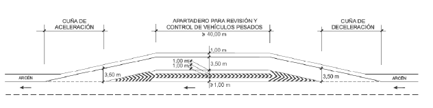 Los apartaderos para revisión y control de vehículos pesados y sus cuñas de cambio de velocidad se dispondrán con la misma pendiente transversal que los arcenes de la calzada principal.
