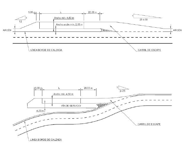 Si el lecho de frenado tiene una vía de servicio contigua al mismo, exclusiva para él y segregada de la carretera, el ancho de dicha vía de servicio será cuatro metros y cincuenta centímetros (4,50 m). Se diseñará la correspondiente divergencia entre el lecho de frenado y la calzada.