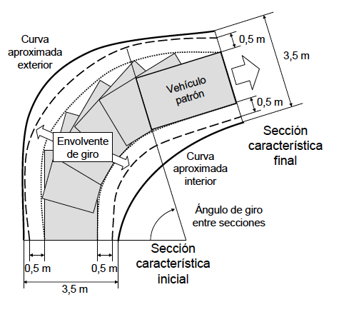 Envolvente de giro es la superficie barrida por el vehículo patrón característico, al efectuar la maniobra correspondiente a dicho giro, incrementada con una holgura de ancho cincuenta centímetros (0,50 m) por cada lado (Figura 8.3) con un mínimo absoluto de treinta centímetros (≥ 30 cm). Adicionalmente se dispondrán los arcenes que procedan.