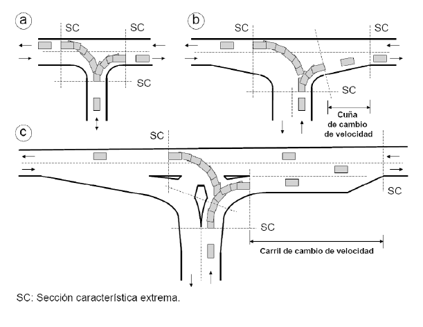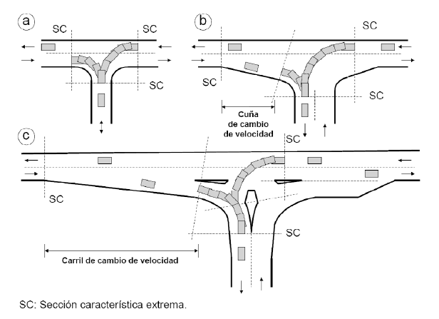 19 Los casos designados con la letra (a) corresponden a situaciones en las que la envolvente de giro constituye el elemento único de transición. Los casos designados con la letra (b)corresponden a situaciones en las que la envolvente de giro está adosada a una cuña de cambio de velocidad. Los casos designados con la letra (c) corresponden a situaciones en las que la envolvente de giro está adosada a un carril de cambio de velocidad.