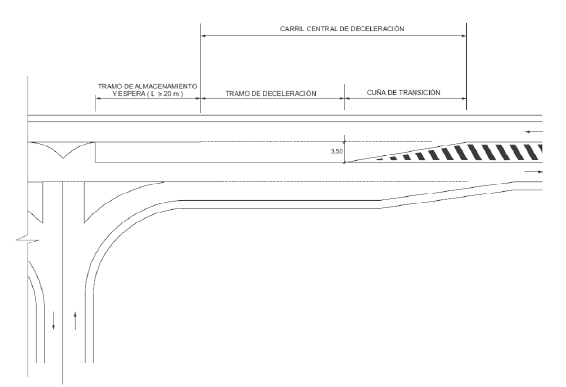 FIGURA 8.6. CARRIL CENTRAL DE DECELERACIÓN, CON TRAMO DE ALMACENAMIENTO Y ESPERA PARA MANIOBRAS DE GIRO A LA IZQUIERDA.