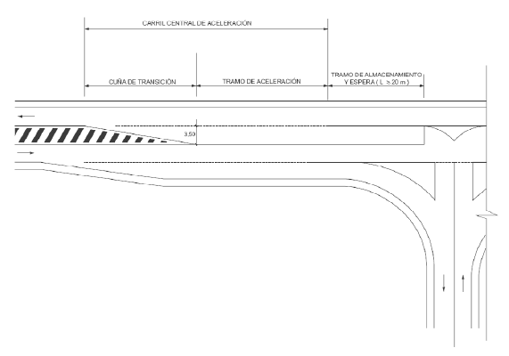FIGURA 8.7. CARRIL CENTRAL DE ACELERACIÓN CON TRAMO DE ALMACENAMIENTO Y ESPERA PARA MANIOBRAS DE GIRO A LA IZQUIERDA.