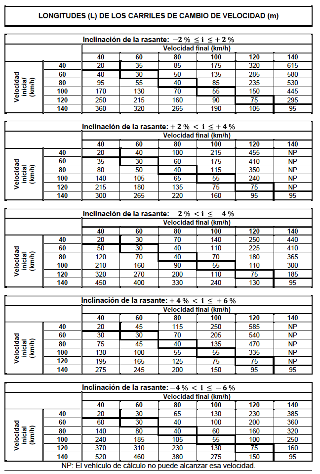 En la Tabla 8.2 se indican las longitudes en metros (m) de los carriles de aceleración y deceleración para valores discretos de la inclinación i de la rasante en tanto por ciento (%) y de las velocidades inicial (Va0 y Vd0) y final (Vaf y Vdf) en kilómetros por hora (km/h), tanto para aceleración como para deceleración. Los valores situados por debajo de las diagonales corresponden a las longitudes de los carriles de deceleración y los valores situados por encima de las diagonales corresponden a las longitudes de los carriles de aceleración. Se podrán interpolar valores en dicha Tabla.
