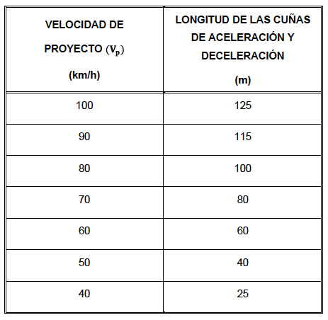 La longitud de las cuñas de cambio de velocidad será la establecida en la Tabla 8.3 en función de la velocidad de proyecto (Vp) del tronco. Se medirá entre el inicio o el final de la misma y la sección en que la separación entre bordes de calzada de la cuña y calzada principal sea de tres metros y cincuenta centímetros (3,50 m), medida perpendicularmente al eje de ésta.