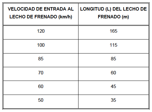 Cuando en el lecho de frenado se disponga gravilla rodada suelta de tamaño 5/10 mm con una profundidad mayor o igual que cincuenta centímetros (≥ 50 cm), se podrá adoptar como longitud (L) del lecho de frenado la indicada en la Tabla 8.4, la cual se aumentará en un tres por ciento (3 %) por cada uno por ciento (1 %) de pendiente descendente de la rasante del lecho de frenado sobre la pendiente nula (horizontal).