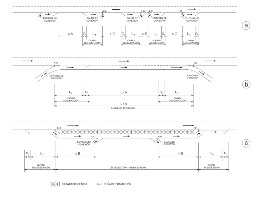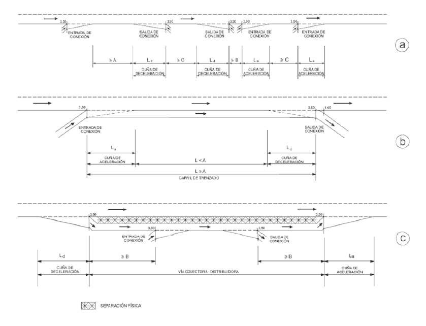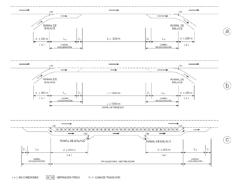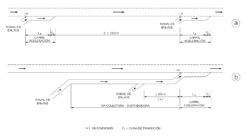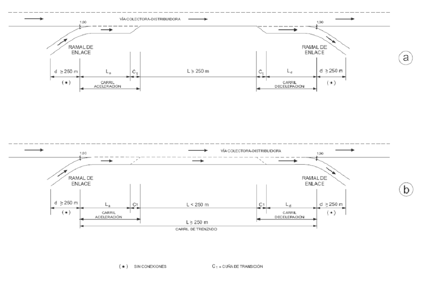 En una vía colectora - distribuidora (Figura 9.5 a), la distancia entre dos conexiones consecutivas será como mínimo de doscientos cincuenta metros ( 250 m). En este caso y sin perjuicio de otras limitaciones, podrán unirse la entrada y la salida posterior (Figura 9.5 b) mediante un carril de trenzado adosado a la vía colectora - distribuidora con una longitud mínima de doscientos cincuenta metros35 ( 250 m) medida entre secciones características de un metro (1,00 m). Si las dos conexiones consecutivas corresponden al ramal de salida y al ramal de entrada posterior del mismo enlace la distancia anterior podrá reducirse hasta un valor mínimo de ciento veinticinco metros ( 125 m).