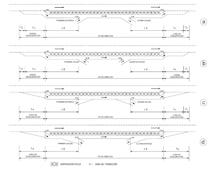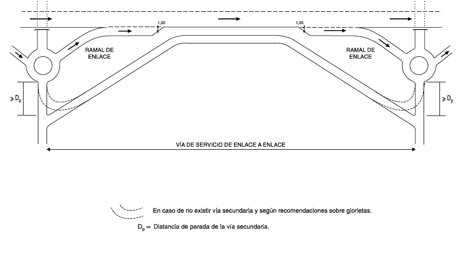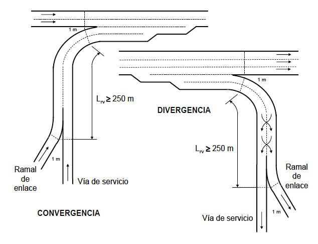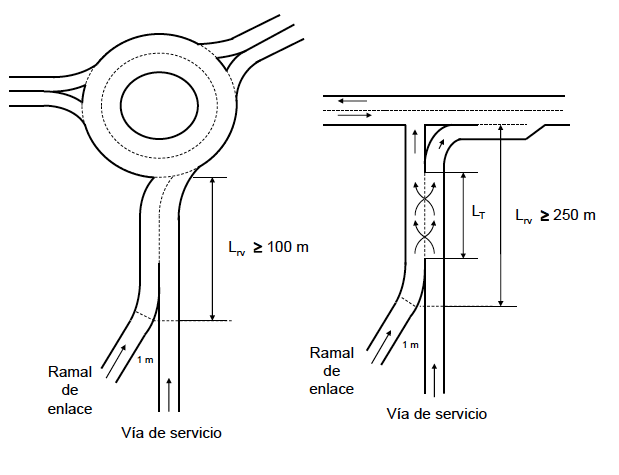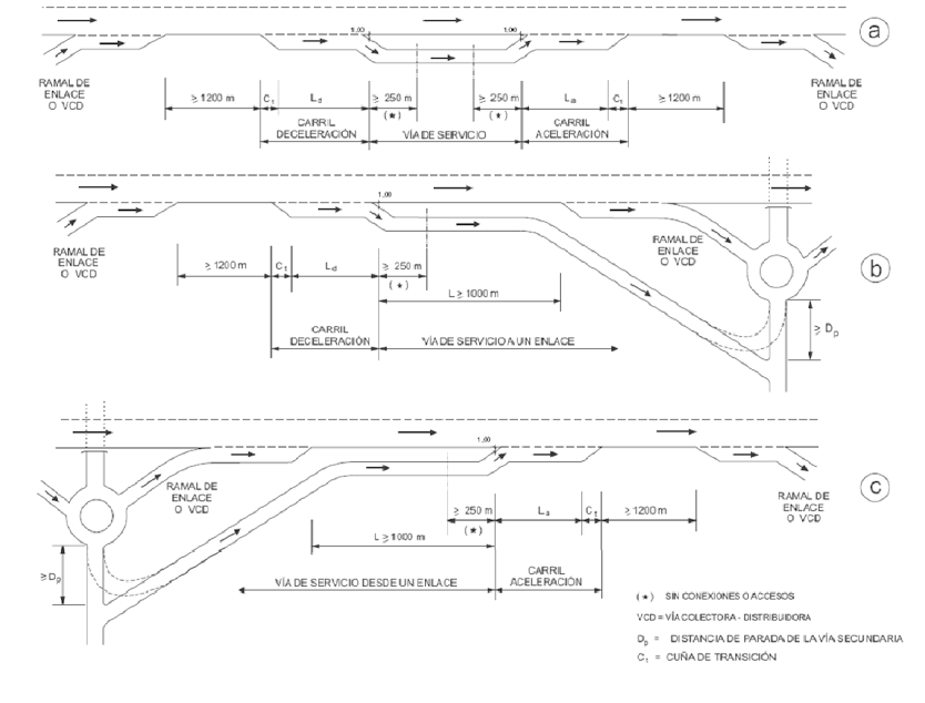 Las vías de servicio se conectarán con las autopistas únicamente a través de enlaces (Figura 9.6), sin que se puedan conectar a su tronco, a sus ramales de enlace y a sus vías colectoras - distribuidoras.