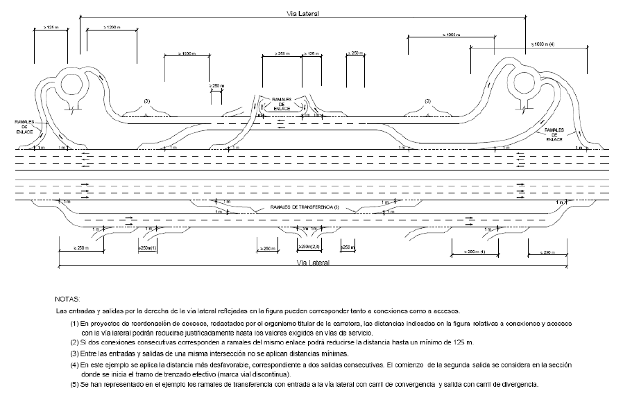 En apartados posteriores se indican las distancias que deben cumplirse entre conexiones y accesos. Estas distancias mínimas no serán de aplicación entre las entradas y salidas de una misma intersección.