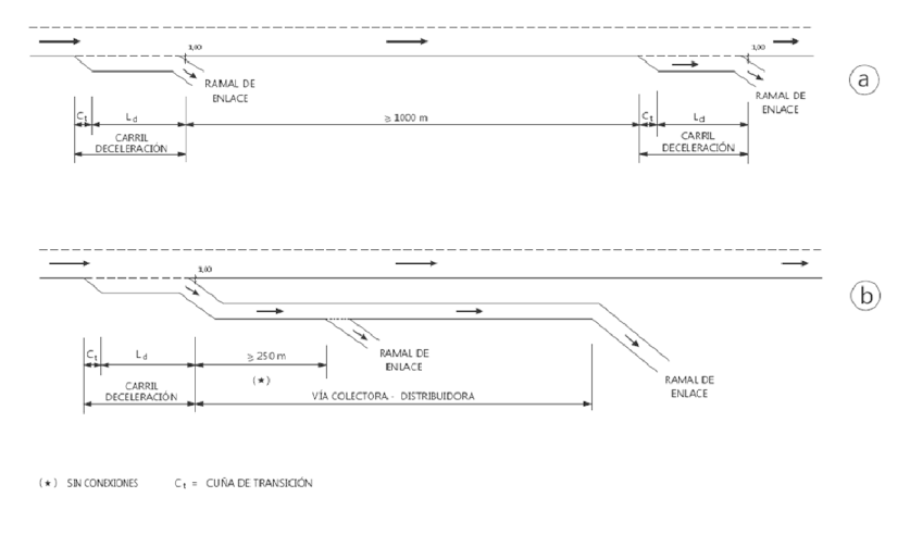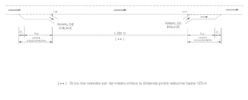 Las conexiones consecutivas de vías colectoras - distribuidoras y de ramales de enlace dotados de carriles de cambio de velocidad (o en su caso, de carriles de convergencia o divergencia) con el tronco de una carretera, medidas entre secciones características, cumplirán que: