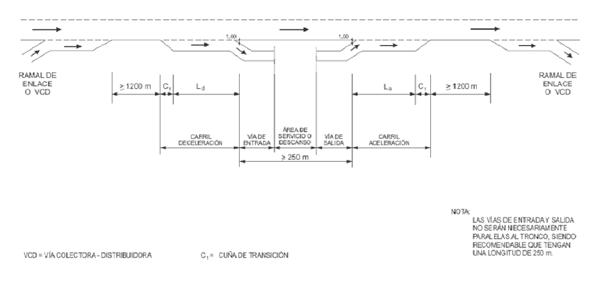 En relación con las longitudes de las vías de entrada y salida de las áreas de servicio y áreas de descanso (Figura 9.8) derivadas de las dos últimas condiciones, será admisible su disminución cuando la distancia entre la salida hacia la vía de entrada al área de servicio o área de descanso y la entrada desde la vía de salida posterior del área de servicio o área de descanso sea como mínimo de doscientos cincuenta metros ( 250 m). Se disminuirá, en su caso, la longitud de la vía de salida con preferencia a la de la vía de entrada.
